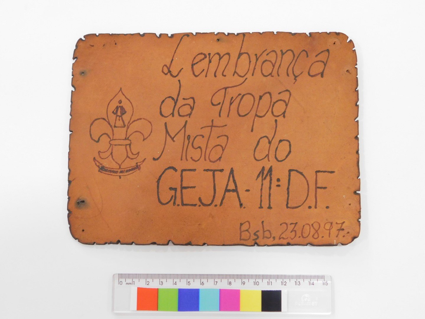 Placa comemorativaPor Matheus Furtado / julho 2, 2021 Documento T003 (2) Baixar MetadadosTítuloPlaca comemorativaDescriçãoPlaca comemorativa de pirografia sobre couro - presenteada pela tropa escoteira mista Grupo Escoteiro Jose de Anchieta 11ºDF.Tipo de itemObjeto ComemorativoAno1997Número de RegistroT003Anexos