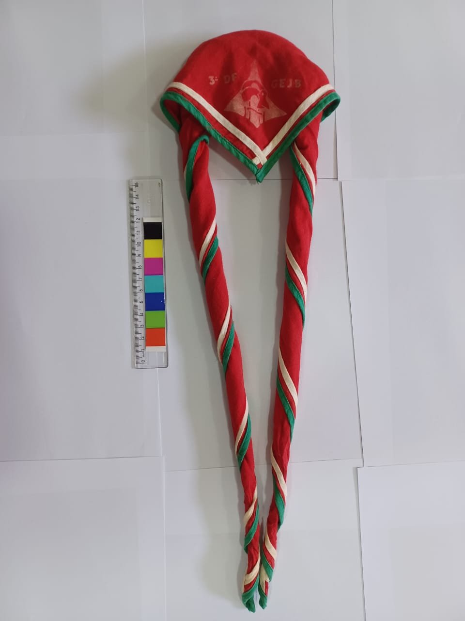 Lenço com pano vermelho, viés duplo em verde e branco. Bolacha: ao centro contém o símbolo o DF, sobreposto pelo pássaro João de Barro em frente ao seu ninho. Inscrições: Ao lado esquerdo do símbolos observa-se o numeral do GE - "3ºDF"; ao lado direito a abreviação do nome da Unidade Local: "GEBJ".